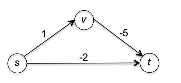 如果直接解决距离包含非负数的问题呢?下图是一个简单的情况。第一次迭代,明显 -2 小于 1,那么会标记到点 的最小距离是 -2,但是很明显最短距离应该是 -4。