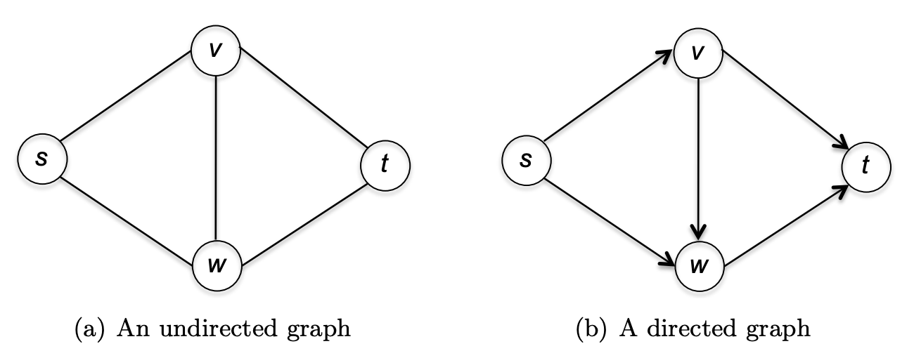从边的类型分析,图可以分成两类:无向图(undirected)和有向图(directed)。无向图的边是无序对 ,称为端点(endpoint),边 和 没有区别。有向图的边是有序对 ,边从 (尾部(tail))到 (头部(head))。如下图所示。