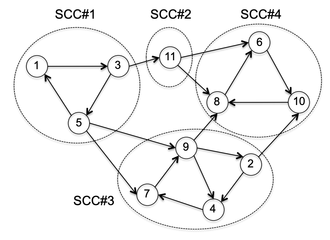 上图如果从顶点 6 开始遍历,不管是 DFS 还是 BFS,我们都会找到一个强连通分量,如图中所示的 SCC#4。但是如果从 1 开始遍历,就无法得到强连通分量了。如果我们能从一个合适的地方开始,那么就能得到强连通分量。如果一个强连通分量是一个汇入(sink)节点,没有出边,从这个强连通分量的任一点开始遍历,都能得到强连通分量,然后去掉这个节点向后寻找连通分量。如果是看对应的元图,那么汇入节点(没有出边)就是拓扑排序的最后一个顶点,向后寻找就是按照拓扑排序的逆序进行。现在问题就是如何找到这个汇入节点,从任一点开始遍历找到第一个连通分类,以此类推。