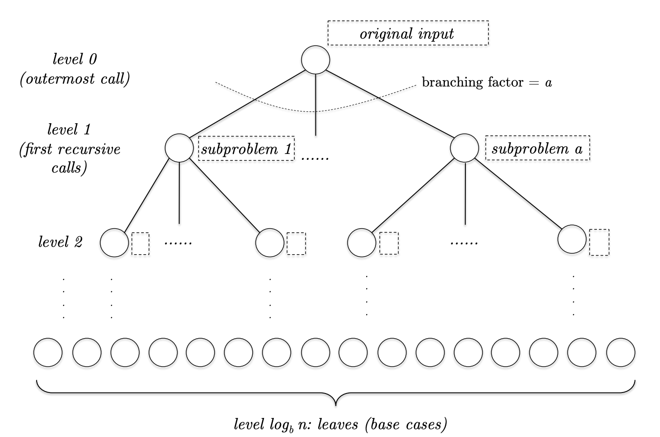 第 层有 个子任务,每个任务的输入规模是 。那么不计算递归调用的时间复杂度是 稍微改写一下 这就出现了结论中很重要的一个比值:。
