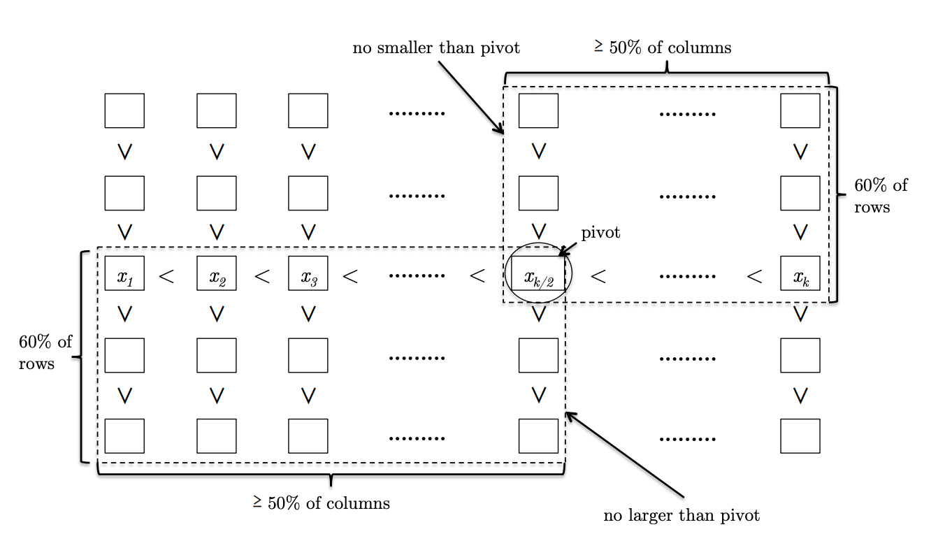 假定第一轮中位数分别是 ,这里 ,中位数的中位数是 ,这个中位数在第二轮中,比 的数大,在那些 的组中,还有两个元素肯定也比中位数的中位数要小,因此这个值比 个元素要大。反过来,这个值比 个元素要小。也就是说,这个中位数的中位数一定处于 30 分位和 70 分位之间。也就是说说,第二次递归的数组规模最大是