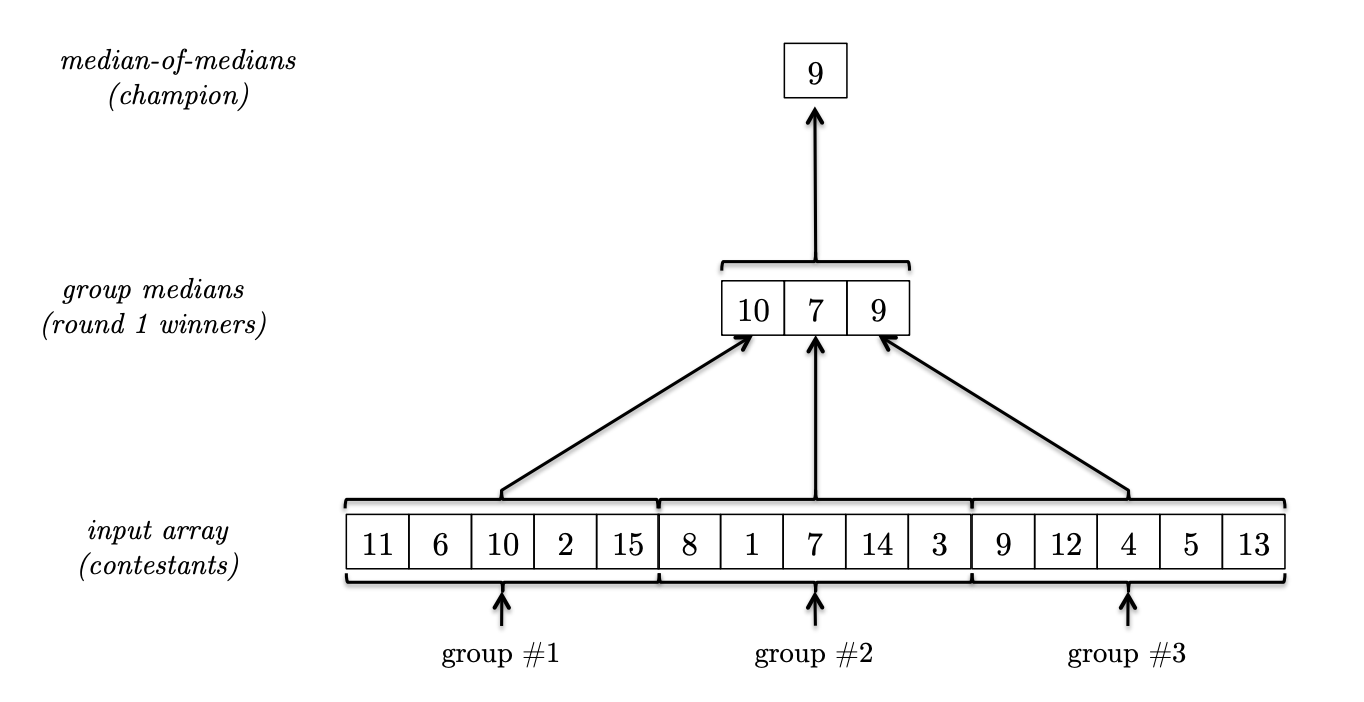 这个算法的核心思想是首先将数组分割成若干个很小的组,计算每组的中位数,然后将这些中位数组成一个数组,然后求中位数作为枢轴元素。如下图所示。五个元素一组,可以使用朴素的暴力法求得每组的中位数,然后求所有中位数的中位数。