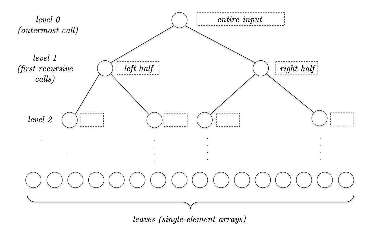 整个过程上图所示。对于归并函数而言,假定两个数组的长度都是 ,那么开销是 。假定第 层有 个子数组,每个数组长度是 ,其中 是原始数组的大小,那么每层合并的开销是 。整棵树的高度是 ,因此归并排序的时间复杂度是 。