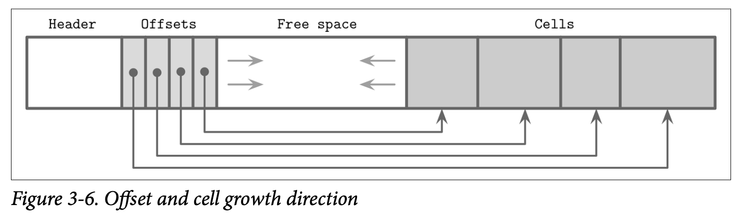两者存放的主要差异在于偏移量和页 ID。由于页大小是固定的并且由页管理系统管理,那么只要有了页 ID 就能计算得到在文件中的偏移量。cell 中的偏移量是页内的信息,是距离页开始的偏移,基数很低,可以用较短的长度表示。