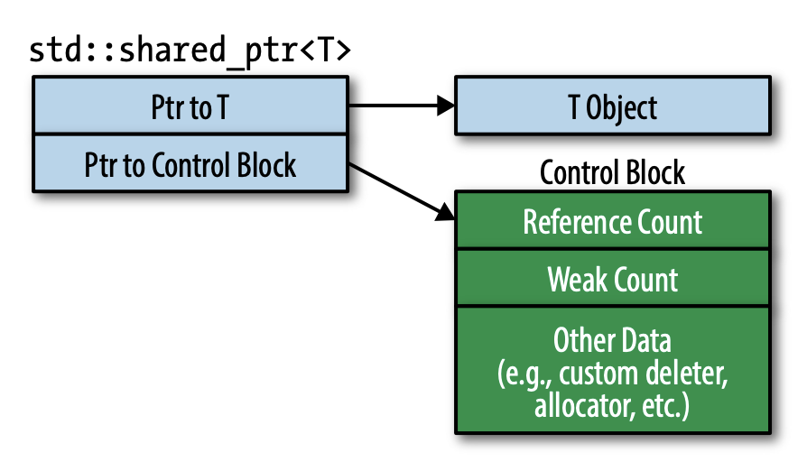 有一个指向引用计数的指针,准确地说,指向控制块,而引用计数是控制块的一部分。如果有自定义删除器,那么控制块就会包含这部分信息,如果有自定义分配器,那么控制块也会包含自定义分配器相关信息。除此之外,还会包含一个次级引用计数,Item 21 会解释。因此 std::shared_ptr<T>