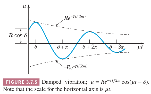 这里最有意思的是第三种情况。如果阻尼比较小,令 中的 A=R\cos\delta,B=R\sin\delta 位移 uu=\pm Re^{-\gamma t/(2m)}tRm,\gamma,k$ 和初始条件。