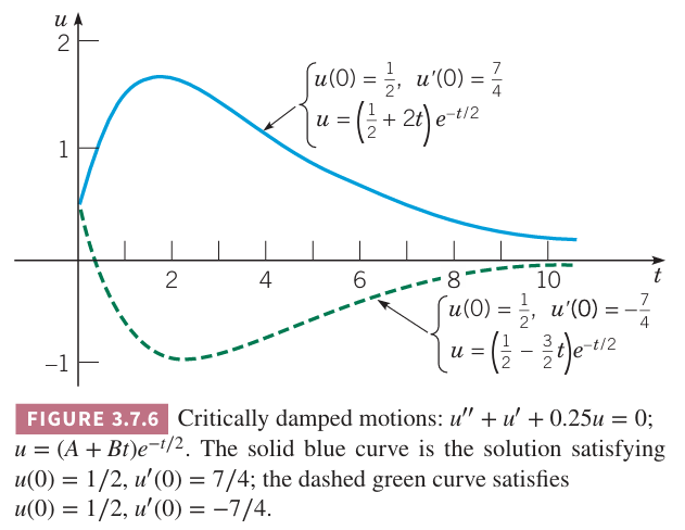 随着 的增加,准频率 减小准周期 增加。当 时 。当 变化经过 ,解的性质会发生变化。 是临界阻尼(critically damped)。对于 称为过阻尼的(overdamped)。这两种情况的解是 和 ,此时物体最多过平衡点一次,如下图所示。物体不会在平衡位置附近振荡。