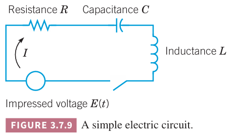 第二个常系数二阶线性微分方程的例子是对电路建模。下图是一个最简单的电路。电阻 、电容 、电感 是常量,电流 、电容的电荷量 和电压 是时间 的函数。