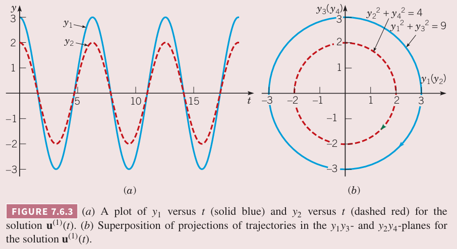 的后两项描述了频率为 1 周期为 的运动。类似的,。这说明两个物体运动反向,第二个物体的位移和速度都是第一个物体的三分之四。和之前类似,分析 ,画出 相对于 的曲线,如下图(a)所示。相位差是 , 的振幅是 的三分之四。(b)图展示了两个物体在各自相平面的轨迹投影。两个图像都是椭圆,内圈从 开始,外圈从 开始,顺时针运动,周期是 。原点是中心。分析 或者是 的线性组合可以得到类似的图像。