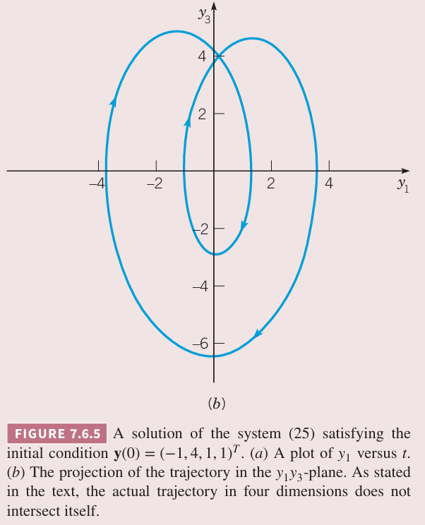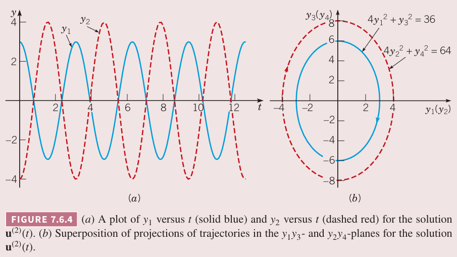 这个方程组的相空间是四维的,每一解由一组特定的 确定,对应着四维空间的一条轨迹。 的解的周期是 ,因此轨迹是闭合曲线。不管 是从哪个点开始,在 时回到起点然后循环。这里无法给出四维空间的区间,而是给出在 平面或者 平面上的投影。