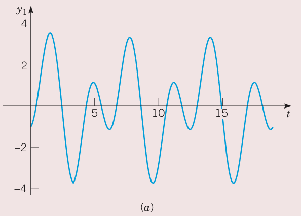解:令 ,那么 写成矩阵形式是 两个物体相对平衡位置的位移, 是它们的速度。假定解 ,其中 是矩阵 的特征值, 是对应的特征向量。可以手算,也可以使用计算机辅助计算。得到 的特征方程是 因此特征值是 ,对应的特征向量是 是共轭解,可以找到其实部和虚部得到实数解。有 类似的 线性无关,因此是基础解系。方程 的通解是 其中 是任意常量。
