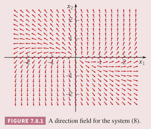 解:方程组 的方向场如下图所示,所有的非零解都远离原点。