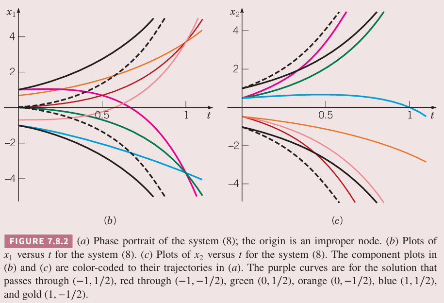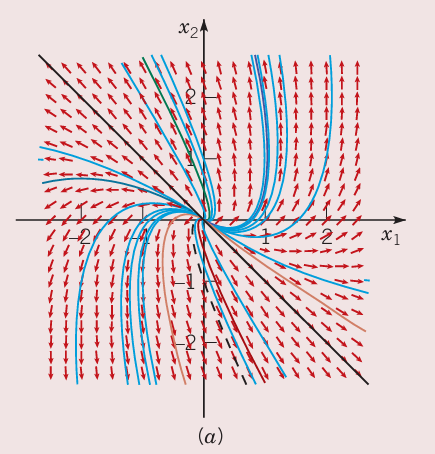 上图(a)是典型的有相同特征值的但只对应一个独立特征向量的 方程组 的轨迹的模式。原点称为非正常节点(improper node)。如果特征值是负数,那么轨迹类似不过方向向内。非正常节点是渐进稳定的或者是稳定的,这取决于特征值的符号。
