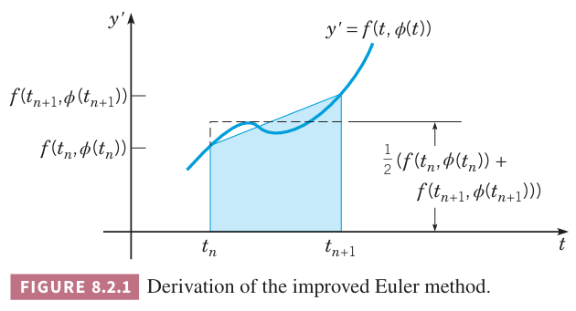 如果 中的定积分有更精确的近似,那么就可以得到初值问题 更精确的近似解。一种方式是使用两个端点的值的平均来近似,即 。在 到 这个区间上的积分近似如下图中的阴影所示。将 替换成近似 ,就可以得到如下公式